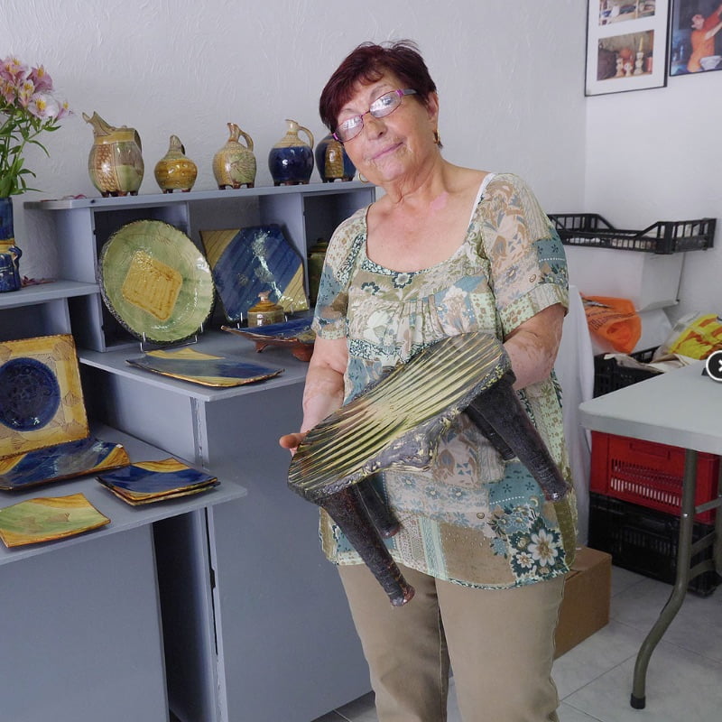 that she made herself from clay. This artist creates works using the Raku or glazed clay technique. She has an exhibition space in Vallauris and continues to take part in international pottery markets and exhibitions in France and abroad.