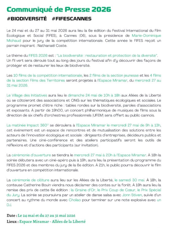 PresseDossier de presse, communiqué de presse, affiches et kit jeunesse Téléchargez le communiqué de presse 2026 Téléchargez le rapport d'activités 2025 Téléchargez le dossier de presse Téléchargez l'affiche du FIFES 2025 Téléchargez l'affiche du FIFES 2025 Téléchargez l'affiche du FIFES carrée Téléchargez le programme du FIFES 2025 Téléchargez la bande annonce du FIFES 2025 Téléchargez le programme Impact 360° Téléchargez le kit jeunesseIls/elles parlent de nous !Articles de presse, interviews Voir l'article de Nice Matin Voir l'article de La Strada Voir l'interview de James Gérard Voir l'article de Cannes Soleil Voir l'article de France Net Info Voir l'article des petites affiches